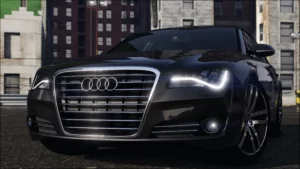 Audi A8 W12 для GTA 5 с автоустановкой с помощью программы OpenIV. Это обновленная версия Ауди с улучшенными текстурами пластика в салоне, отражениями на древесине. Автомобиль поддерживает все функции игры, рабочие фары, приборная панель и габариты. Есть отражения в зеркалах и правильные пропорции автомобиля.